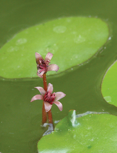 You are not going to believe those leaves! They are small compared to the big round water lilies. They are elliptical in shape, one-to-two inches wide and two-to-three inches long. They’re green above and maroon-colored below. Gently turn over a leaf to see the dark contrasting color. You will observe that the petiole (the stem of the leaf) is attached directly to the middle of the leaf blade. This unusual characteristic makes it a peltate leaf. The common woodland spring wildflower May Apple, Podophyllum peltatum, also has a peltate leaf, as the Latin name describes.