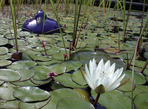 An unidentified blue duck floating on a sea of water shield in one of the Botanical Garden’s aquatic tanks. The little red water shield flowers are dwarfed by the larger adjacent water lily. Do you recognize that little critter in the water lily? Photo by Chris Liloia, Botanical Garden curator