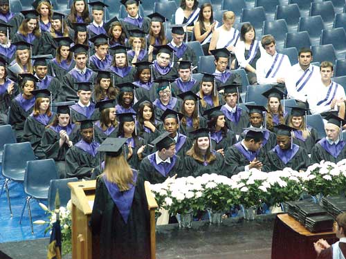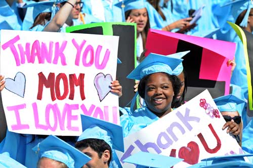 PHOTO BY DAN SEARS, UNC NEWS SERVICES. Graduates hold signs thanking their mothers during the 2010 UNC commencement last Sunday.