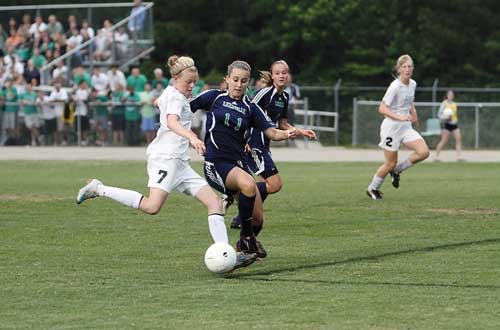 PHOTO BY TED SPAULDING. Taylor Boone (#10) of East Chapel Hill High School and Sarah Floyd of Leesville Road High battle for the ball last Saturday night during a fourth-round game of the North Carolina High School Athletic Association 4A East playoffs at East Chapel Hill High. Leesville Road won, 1-0, to advance to the regional championship game, where they lost to Hoggard High School.