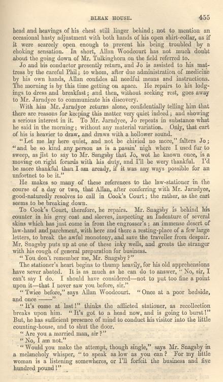 “Now, I wish Mr. Jarndyce and Miss Summerson at least to know that this Jo, who tells so strange a story, has re-appeared; and to have it in their power to speak with him, if they should desire to do so. Therefore I want to get him, for the present moment, into any poor lodging kept by decent people, where he would be admitted. Decent people and Jo, Mr. George,” says Allan, following the direction of the trooper's eyes along the entry, “have not been much acquainted, as you see. Hence the difficulty. Do you happen to know any one in this neighbourhood, who would receive him for a while, on my paying for him beforehand?”