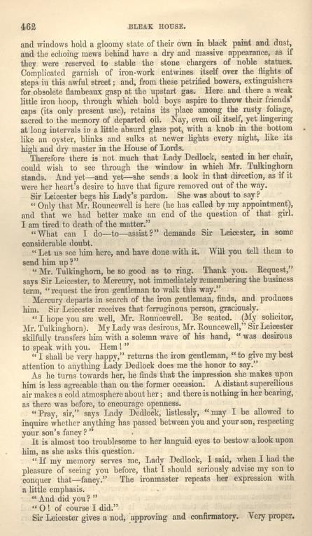 “Now, George,” continues Mr. Bucket, putting his hat upon the table, with an air of business rather in the upholstery way than otherwise, “My wish is, as it has been all the evening, to make things pleasant. I tell you plainly there's a reward out, of a hundred guineas, offered by Sir Leicester Dedlock, Baronet. You and me have always been pleasant together; but I have got a duty to discharge; and if that hundred guineas is to be made, it may as well be made by me as by another man. On all of which accounts, I should hope it was clear to you that I must have you, and that I'm damned if I don't have you. Am I to call in any assistance, or is the trick done?”