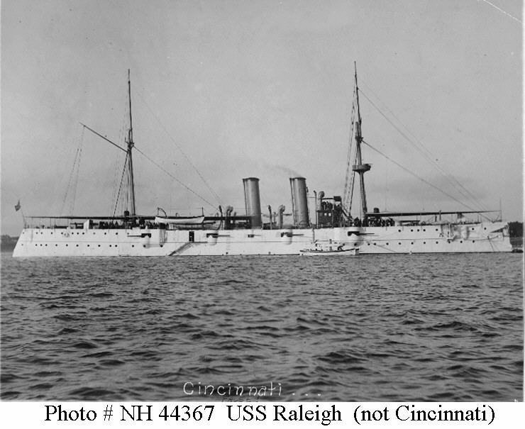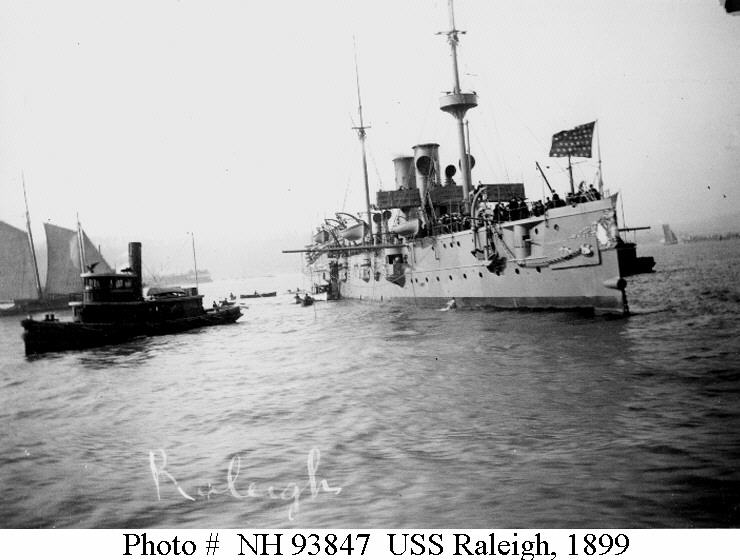 | Photo #: NH 44367 USS Raleigh (C-8) Photographed circa 1894-99. Identification on the original photo of this ship as Cincinnati is incorrect. Details of bow decoration confirm that this cruiser is really Raleigh. U.S. Naval Historical Center Photograph. Online Image: 66,839 bytes; 740 x 605 pixels |