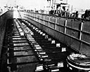 Wingwalls are down to reduce wind resistance. Repair equipment is stowed on deck.towed at a speed of 6 to 8 knots without excessive power. In the assembled docks, the flat bows and sterns formed interrupted berths alongside to which barges and vessels could be readily moored.