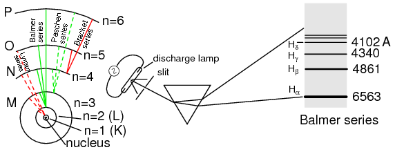 Bohr hydrogen atom (with orbits drawn to scale) only allows electrons to inhabit discrete orbitals. Electrons falling from n=3,4,5, or 6 to n=2 accounts for Balmer series of spectral lines.