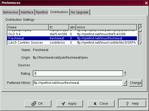 En la pestaña Asignaciones de la distribución [Distribution Settings], podrá asignar las opciones para elegir el paquete más adecuado a partir de las selecciones que devuelve Rpmfind, además de cuál nodo réplica le gustaría usar. Cuanto mayor sea la puntuación que usted indique para su selección (como se muestra en la figura [*]), mayor será la prioridad que recibirá; la menor puntuación, como -1, especificará qué paquetes no son recomendados.