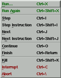 Podemos ejecutar el programa e interrumpirlo, si lo hacemos desde el menú podemos introducir parámetros para la ejecución mediante un cuadro de diálogo. Step ejecuta el programa una línea mas (paso a paso), esto es, si se hace una llamada a una función, se recorrerán las líneas de ésta, a diferencia de Next, que la tratará como una sola línea.