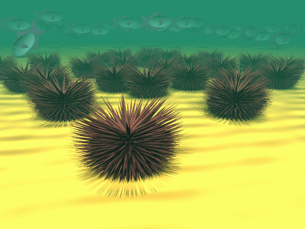 Oursins de merL'exemple suivant est un bon exercice pour réviser sa géométrie. Vous pouvez remarquez que les piquants d'un oursin on un placement bien particuliers que l'on ne peut pas improviser, il faut l'analyser, choisir un algorithme et l'implémenter en connaissant exactement l'effet recherché. Le code source est largement commenté afin d'être le plus clair possible. C'est un cas pratique de déclaration de structure itérative, dans ce cas nous avons choisi d'utiliser Povray comme langage d'implémentation mais il n'existe aucune raisons qui empêchent de le faire d'une autre manière comme nous le verrons plus tard avec un programme externe.