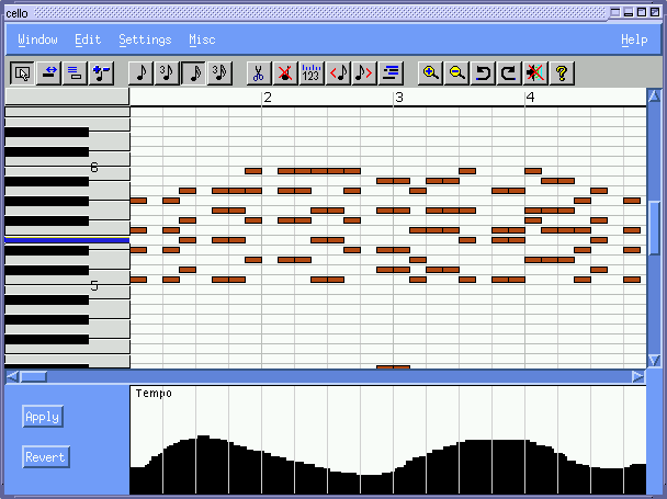 Premete Misc-->Edit Pitch nella Piano Window. Funziona in modo analogo alla modifica del tempo in una parte del pezzo: Apparirà un nuovo campo sotto le note che vi permetterà di disegnare il tono con il mouse.