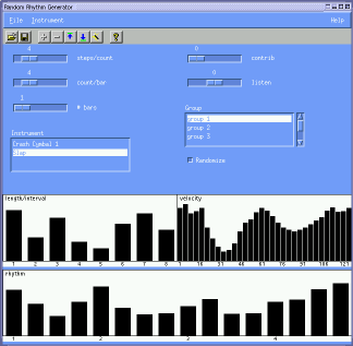 [Random Rhythm] Selezionate l'area della vostra traccia a cui volete applicare il ritmo casuale. Aprite il Random Rythm Generator clickando Misc-->Random Rythm nel menu della track window. All'inizio dovrete selezionare uno strumento. Poi potrete impostare tutte le variabili che vedete nella finestra e generare il ritmo clickando su Instruments-->Generate. Dopodiché potete continuare con un altro strumento finché sarete soddisfatti.